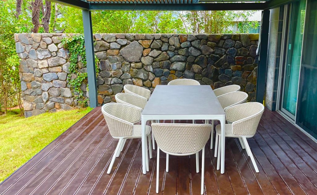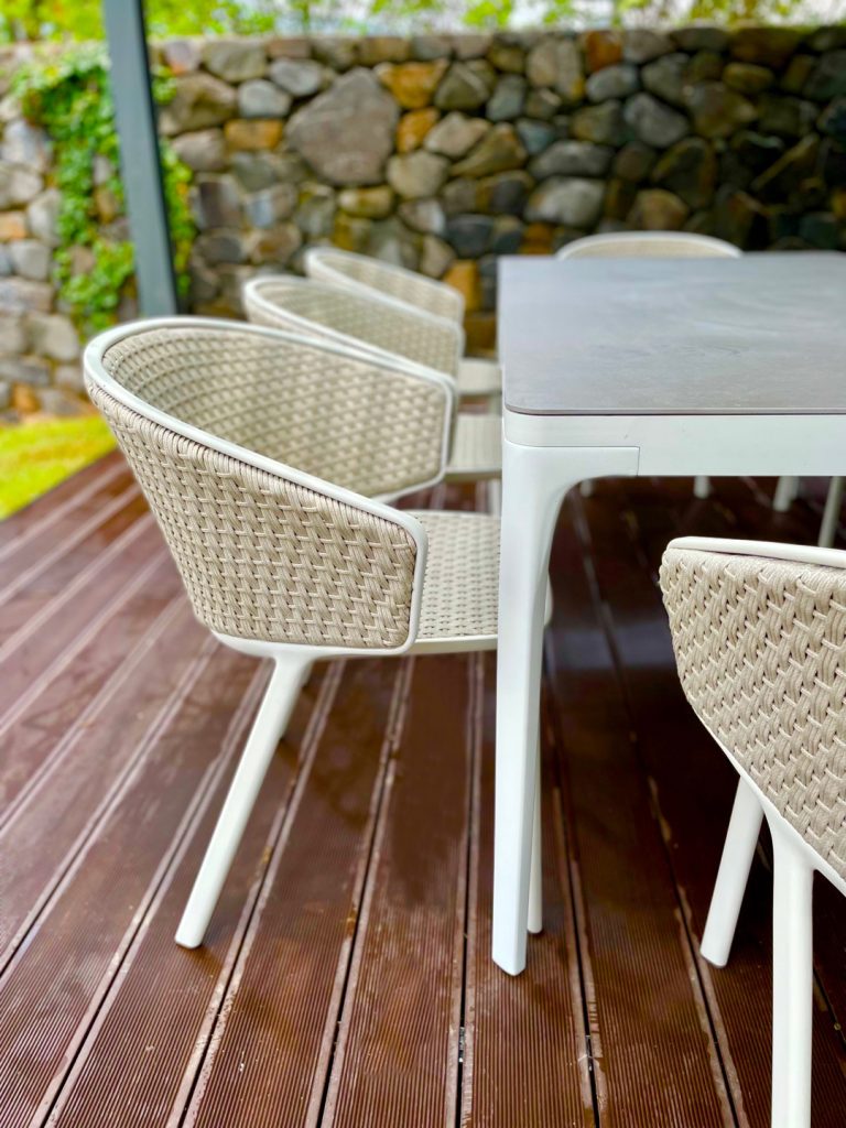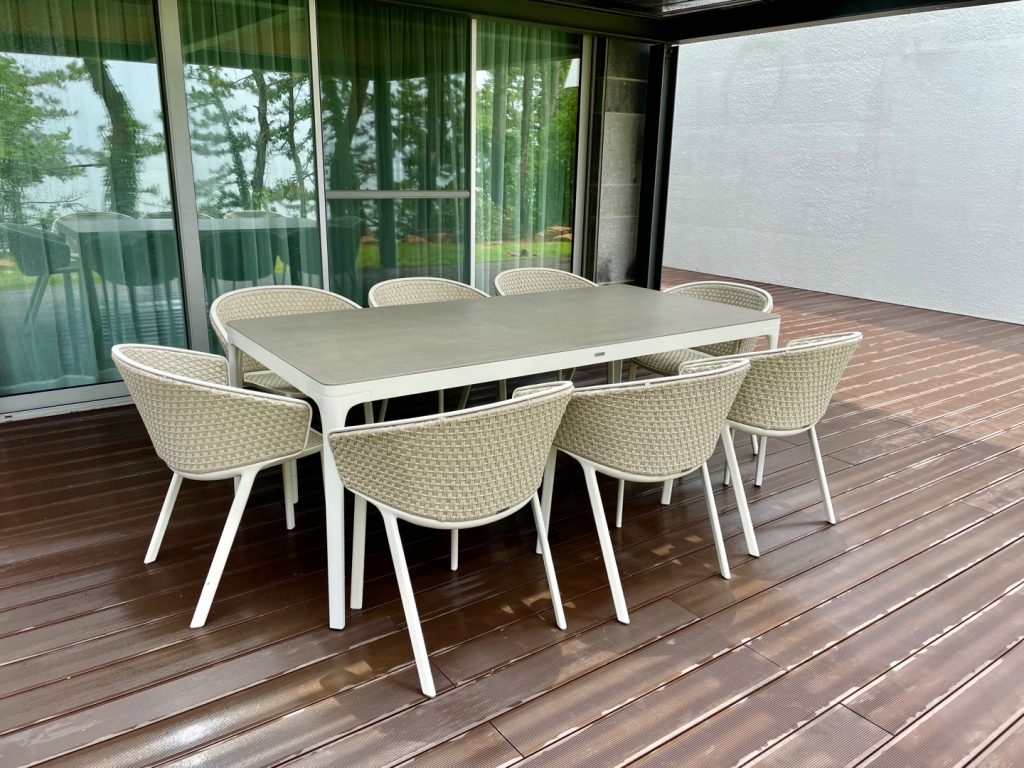 Ethimo의 Play 테이블과 Pluvia 다이닝 체어는 가족이 한자리에서 자연과 함께 즐길 수 있는 식사 자리를 제공한다. 한국이지만, 지중해의 감성을 담고 있는 Ehimo의 가구와 어우러진 남해의 경치는 장소를 초월하는 휴식의 시간을 만들어 준다.