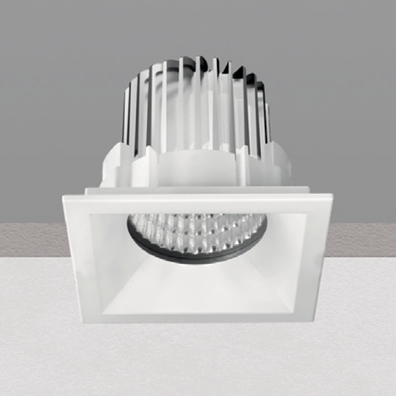 A complete line of square recessed spotlights characterised by IP44 protection index and polycarbonate flange. Cob44 available with round or square flange, fixed or tilting optical assembly and two power levels.