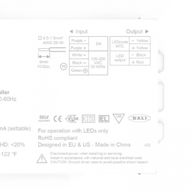 • UL: Recognized Component (E333135), according to UL1310 and UL8750. US/Canada: Class 2 output. Type TL LED driver.