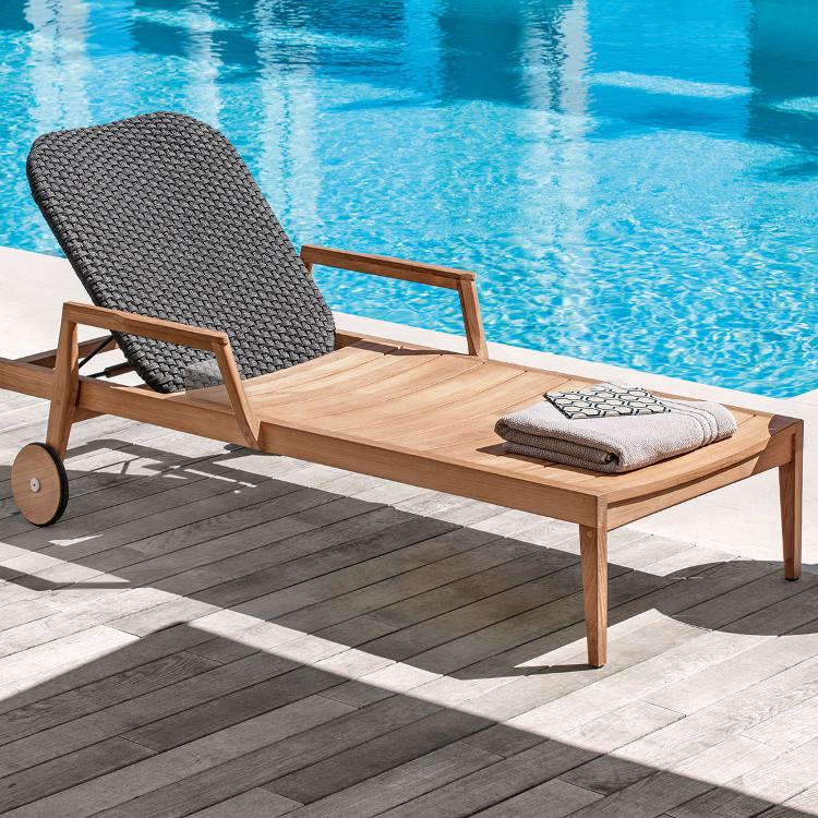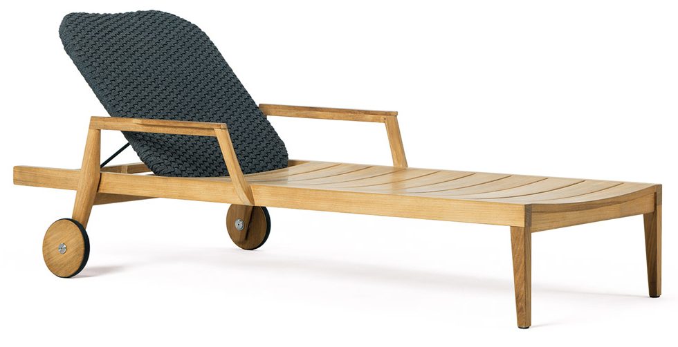 Material: teck naturel et dossier inclinable en corde tressée.