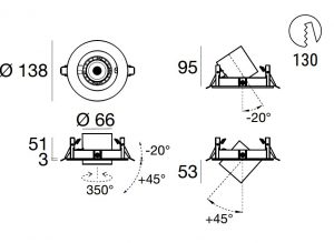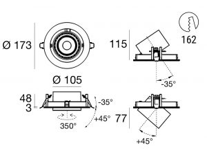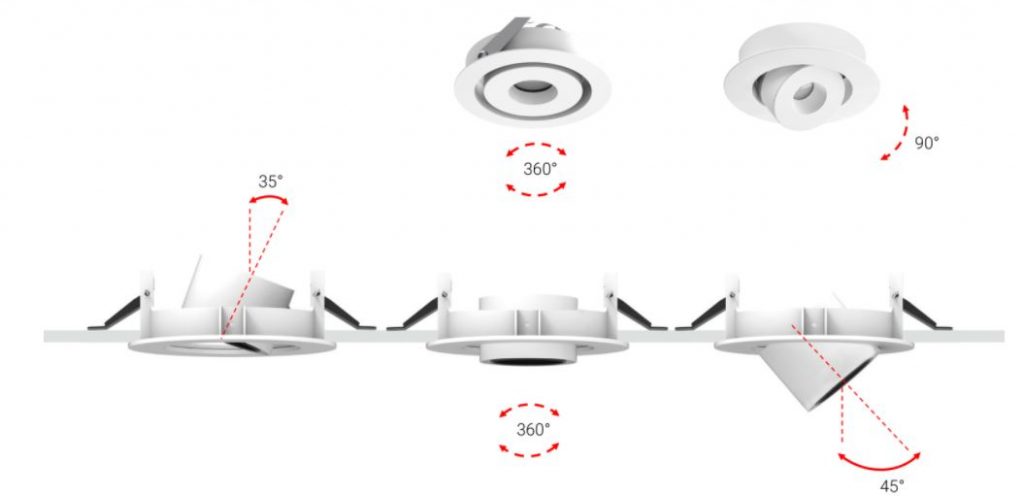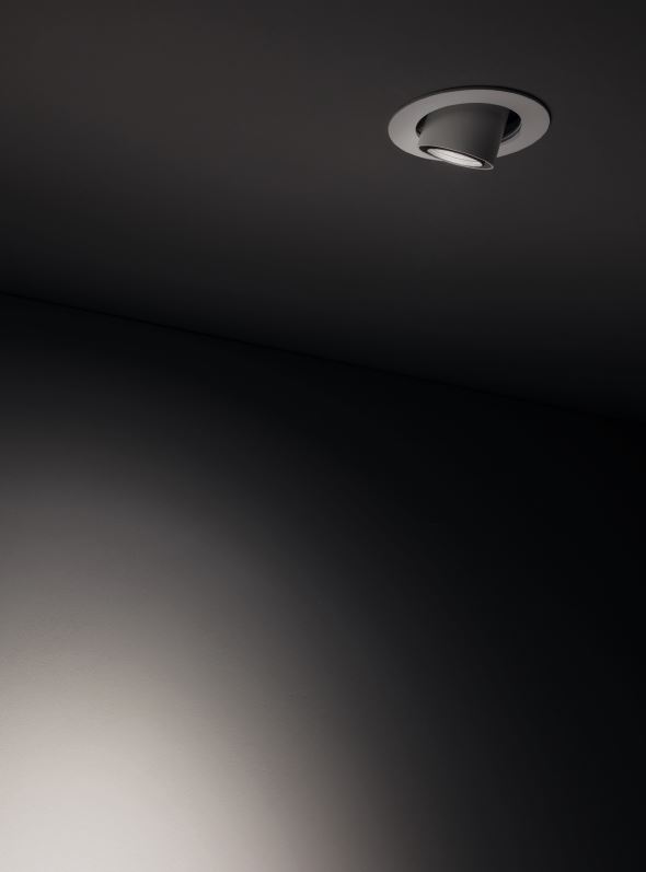 Optux EX downlights come with a 350° mobility on the horizontal axis and an incliantion on the vertical axis that allows a max 20° recess or an up to 45° extracation of the spotlight.