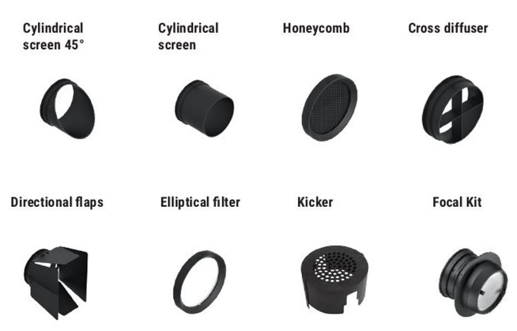 Optus_EX is compatible with a wide range of light emission control accessories, standard cylindrical screen and at 45 degrees fully or partly eliminating the secondary beam and reducing the light cone: cross-like and honeycomb diffuser, for controlling and reducing glaring more or less markedly, directional fins and elliptical filter, for shaping the light or creating ovalized projections.