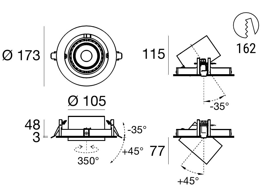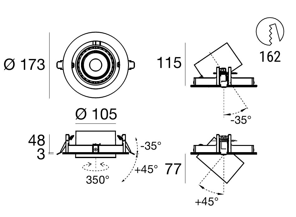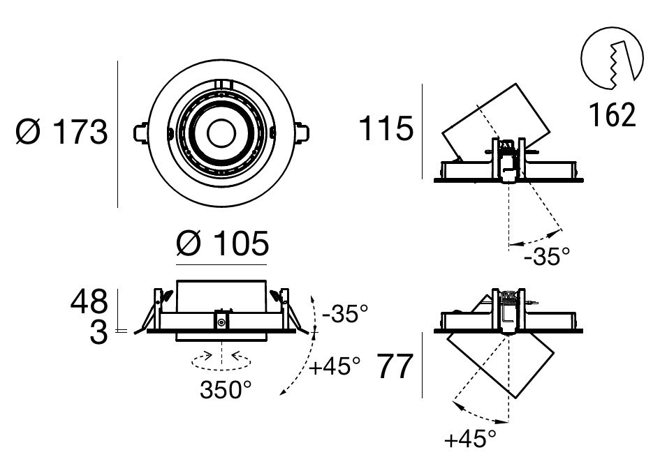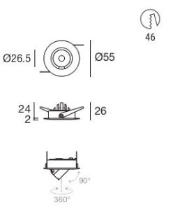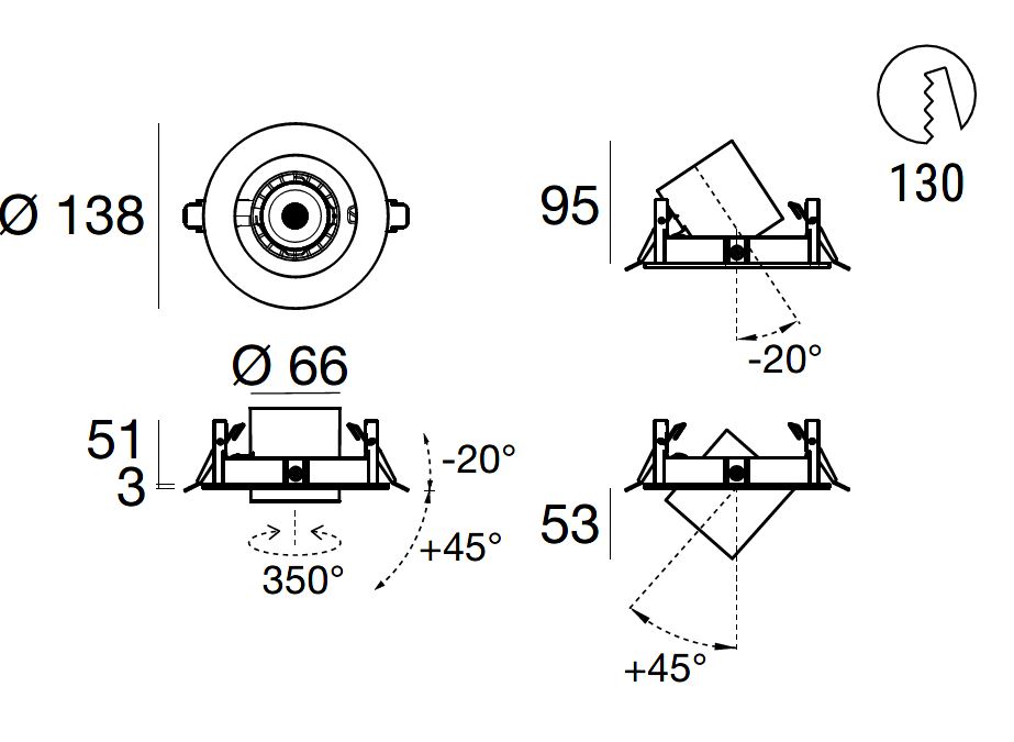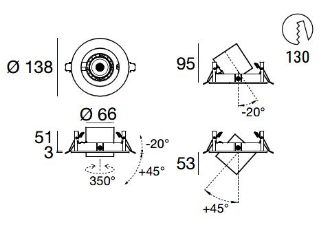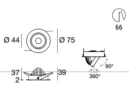 Optux EX downlights come with a 350° mobility on the horizontal axis and an incliantion on the vertical axis that allows a max 20° recess or an up to 45° extracation of the spotlight.