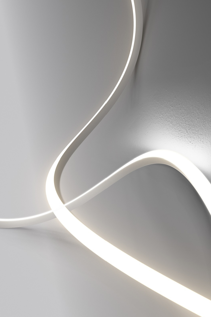 Rubber 3D is unique in its kind. Thanks to the patented structure of the internal circuit, the product can bend on all axes and make new installation methods and application concepts possible. There is no limit to imagination: organic and fluid curved structures with abrupt direction changes are no longer a problem, thanks to the unrestricted flexibility of Rubber 3D. The length can be adjusted based on the specific minimum cut interval of each model, offering high versatility for diverse applications. The input/output cables permit the connection of multiple fixtures in series, maintaining uniform and constant light for the entire overall length of the installation, without interruptions in the junction points |