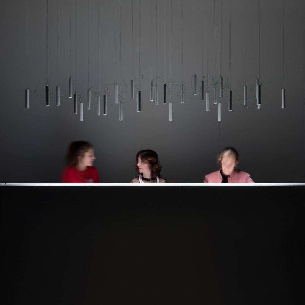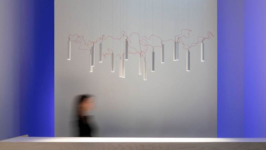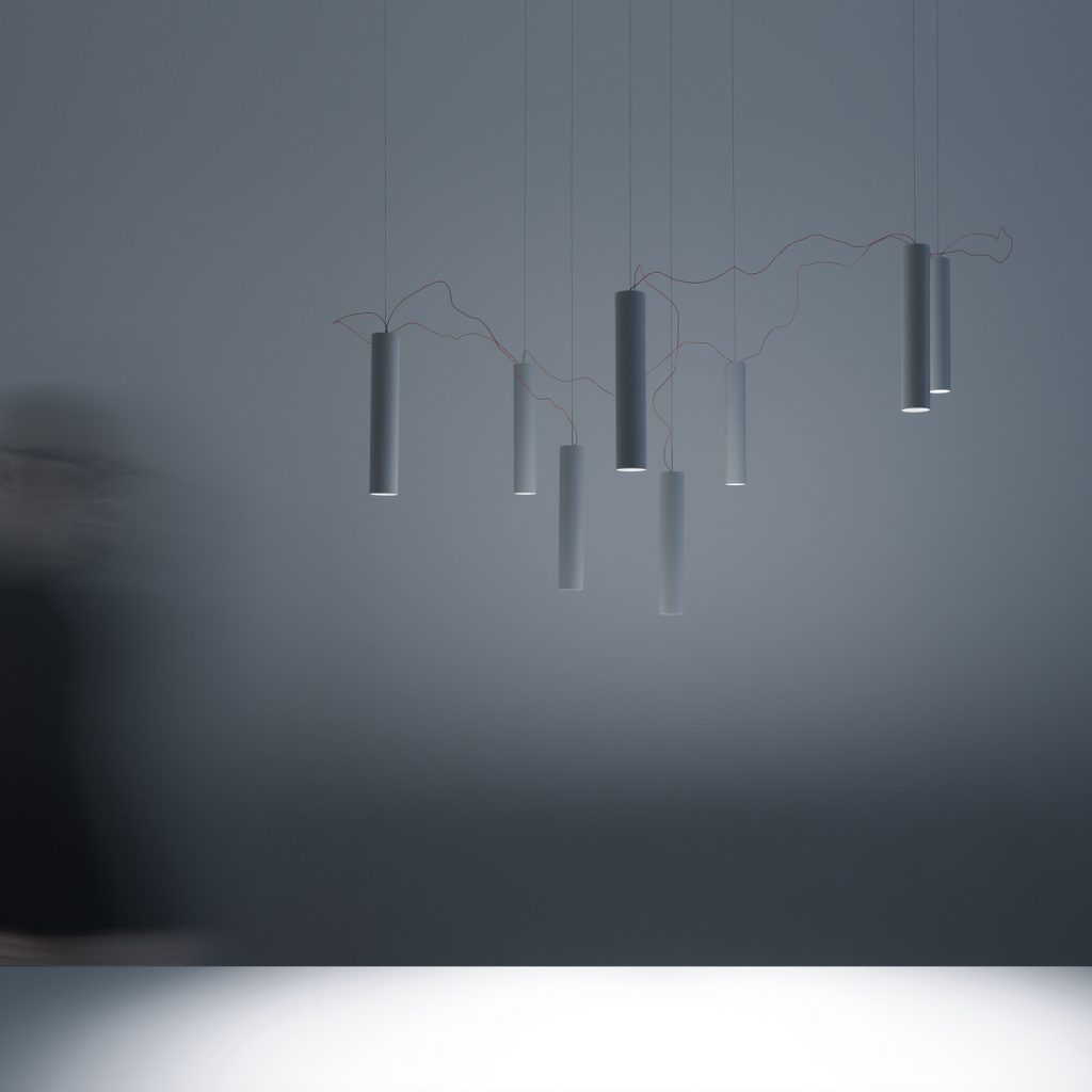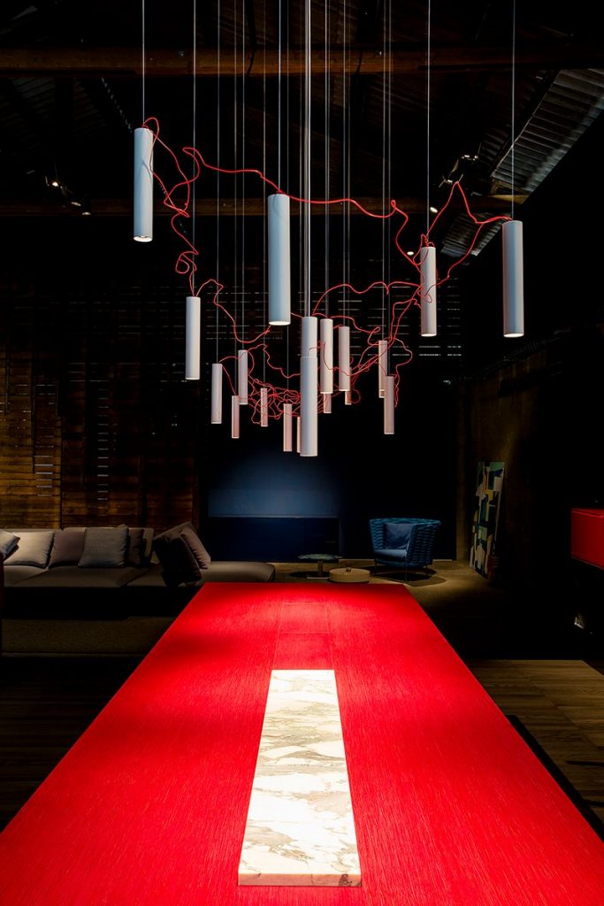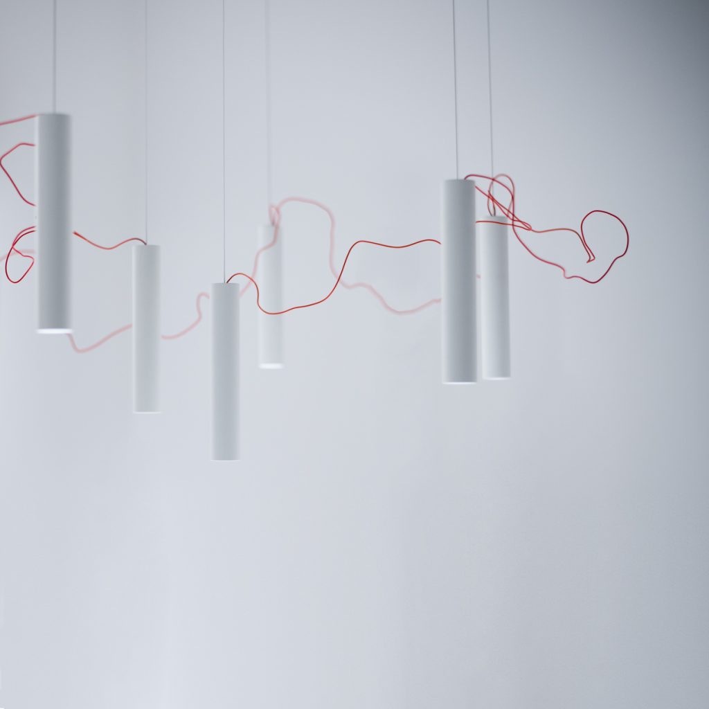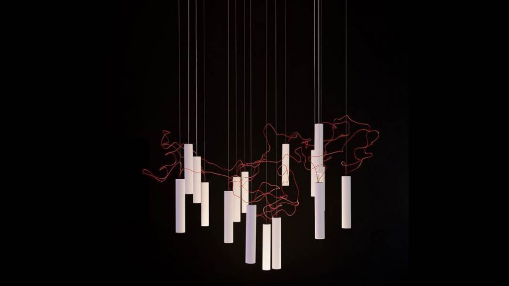 광원들 사이를 잇고 있는 빨간색 전선은 서로의 관계를 연결하고 전체 조명을 살아 있게 만들어 주고, 또한 SIMBIOSI의 디자인에서 핵심적인 요소이다. David groppi가 보여주는 시적인 지향점이 디자인적인 언어를 통해 만들어진 결과물이다.