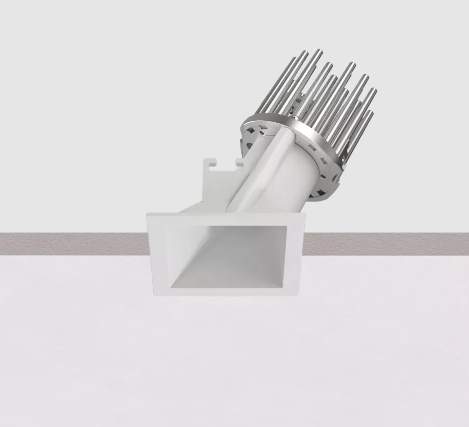 Warp_QY는 슬림한 플랜지가 특징인 사각형 매립형 스포트라이트로, 천장과 자연스럽게 조화를 이룹니다. 이 제품의 형태는 빛 효율성을 최적화하면서 우수한 시각적 편안함을 보장하도록 특별히 설계되었습니다. 비대칭으로 25° 기울어져 있어 측면 표면에 균일한 빛 분포를 제공합니다.