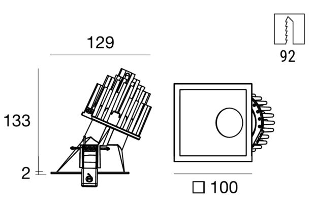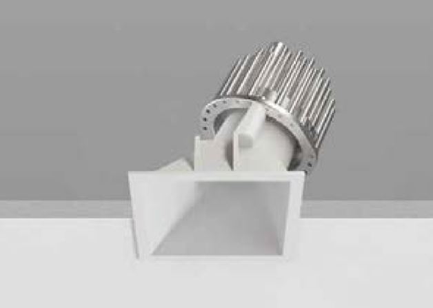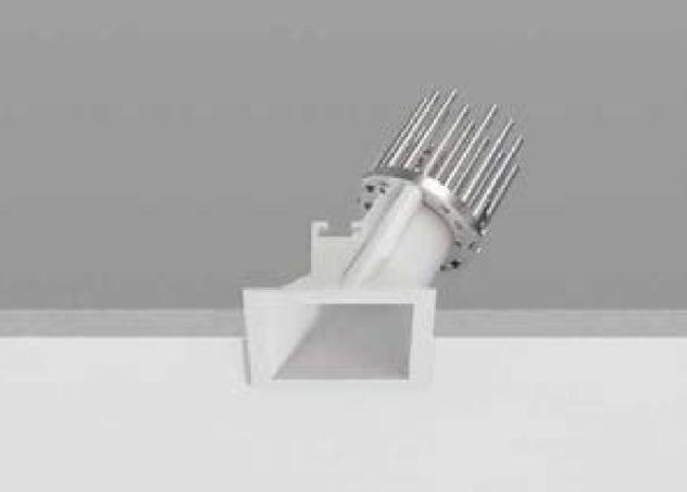 Warp_QY is a square recessed spotlight with a slim flange that harmonizes with the ceiling: its shape has been specially designed to optimize light efficiency while ensuring excellent visual comfort. It is asymmetric, tilted by 25°, allowing for uniform light distribution on the lateral surfaces.